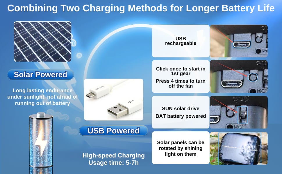 This fan hat has two power supply modes, solar power supply or USB charging,