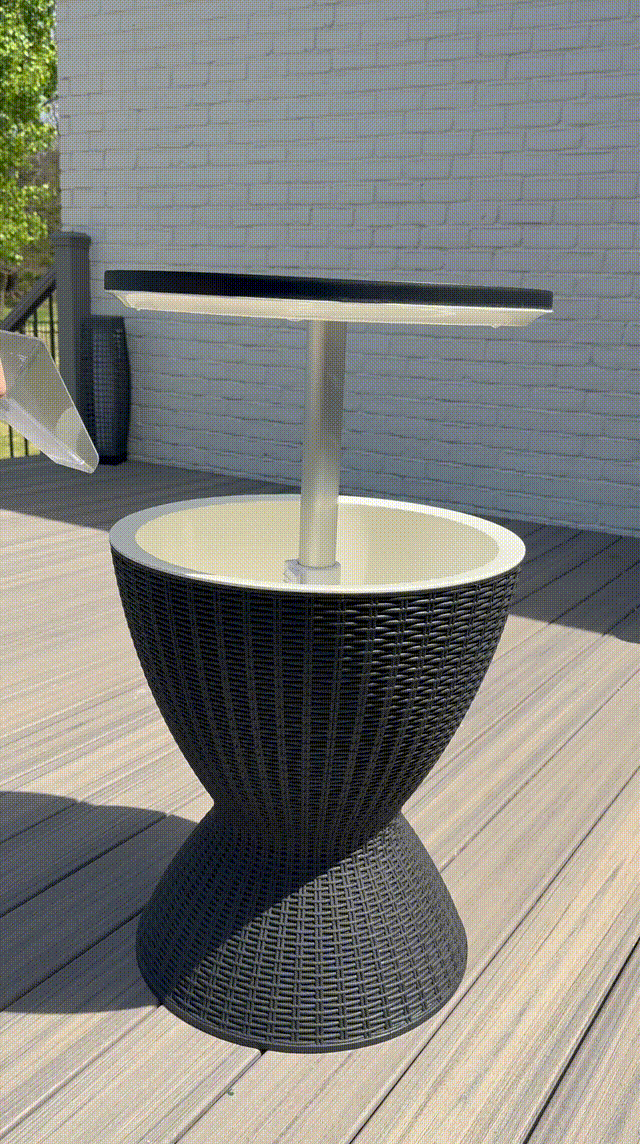 The Cool Bar Table is the ultimate 2-in-1 beverage cooler and cocktail table for indoor and outdoor entertaining. With a 7.5-gallon capacity, this stylish rattan-look table keeps drinks icy cold for up to 12 hours while transforming into a height-adjustable serving surface. Perfect for patios, poolside gatherings, or home bars!